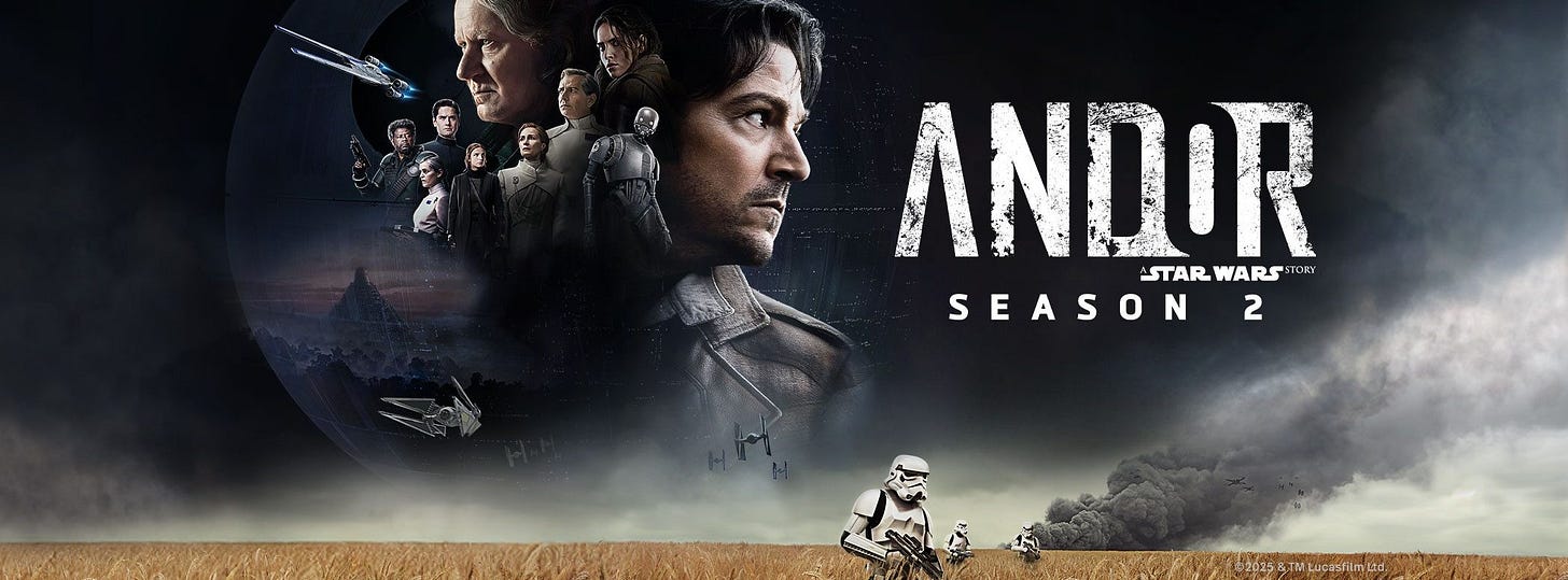 Right now, I’m savoring the 12-episode second season of Star Wars: Andor, the wonderful series starring Diego Luna as rebel operative Cassian Andor. It’s a prequel centered on the creation of the rebel alliance which opposes the evil Emperor and Darth Vader – telling the story in shades of gray which involves espionage, murders, undercover operations and lots of morally questionable activities guaranteed to keep those who consider themselves righteous people up at night.