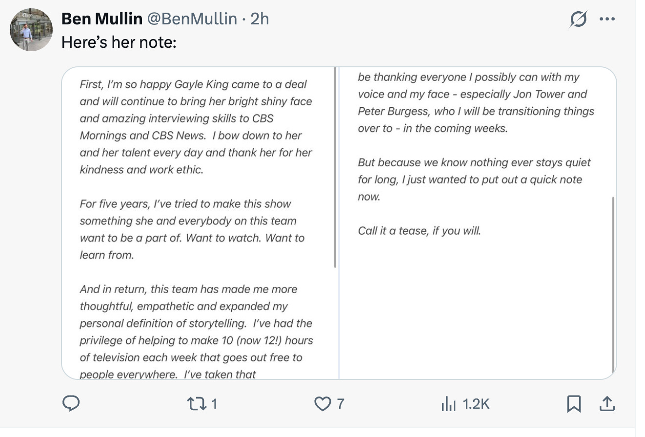 The latest news from CBS is that Shawna Thomas, executive producer of CBS Mornings, is leaving the show at the end of the month. I’ve met Thomas before, and she’s a powerful, sharp producer who also happened to be one of the few Black women in a position of power in network TV news. While Weiss managed to strike a new deal with host Gayle King, avoiding the optics of displacing one of the network’s most popular personalities, there are still questions about where diversity stands at the network and whether people of color are getting demoted and displaced at a greater rate than their white counterparts.